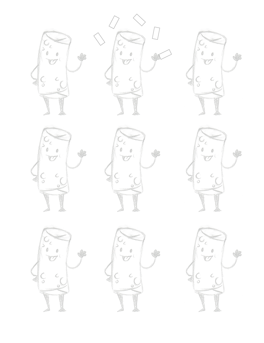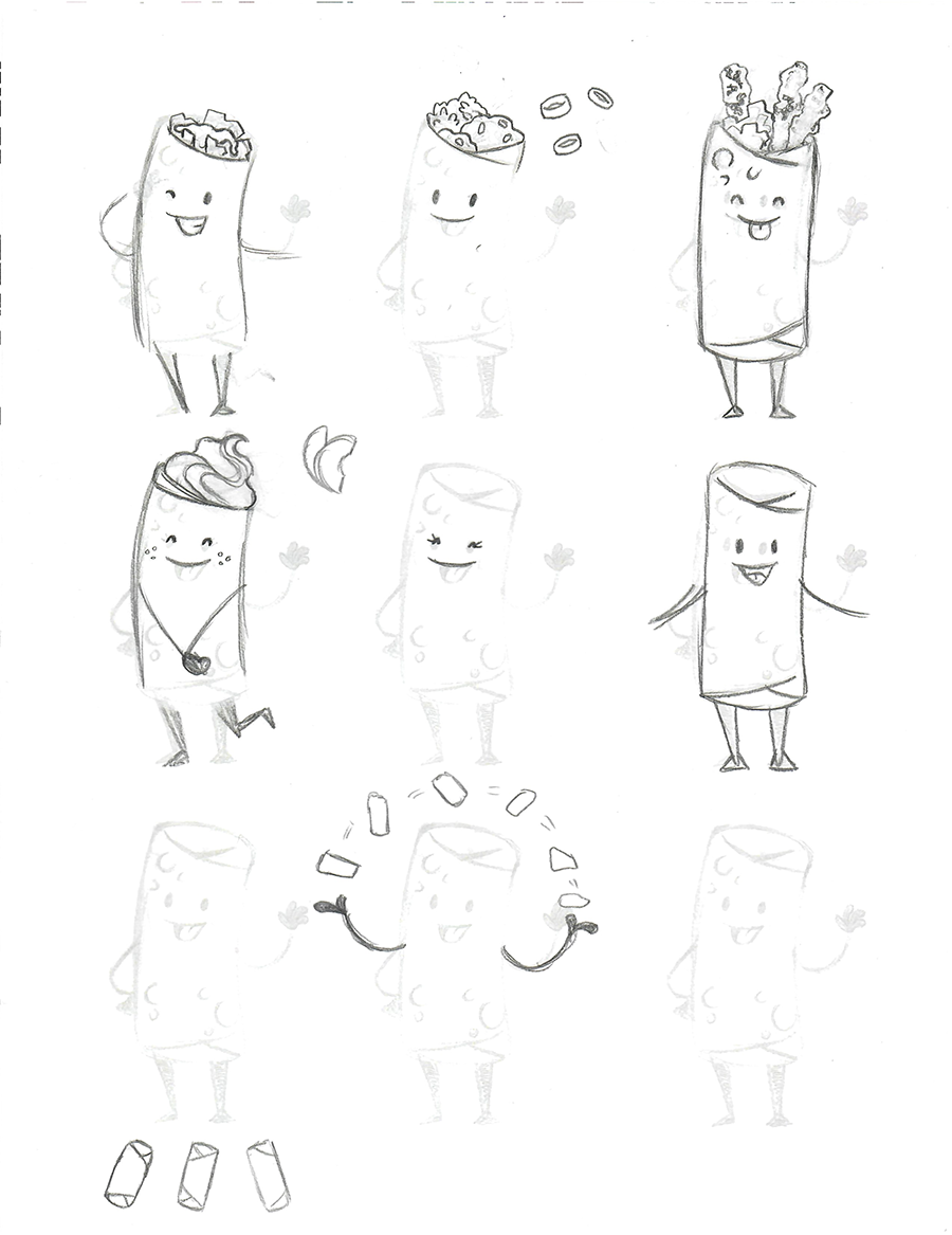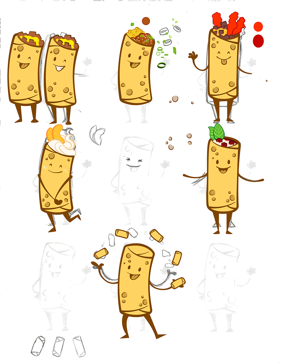 I sketched out each eggroll and their signature look (aside from pepperoni pizza, who I think I did entirely in Illustrator) .